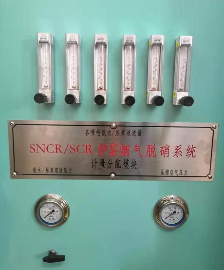還原劑依次通過壓力表、流量傳感器、電動(dòng)執(zhí)行球閥及角座閥,按照控制系統(tǒng)給定的流量設(shè)定計(jì)量輸出,在分配穩(wěn)壓緩存后以相同的壓力分別經(jīng)過可調(diào)節(jié)浮子流量計(jì)被送到還原劑出口管道。